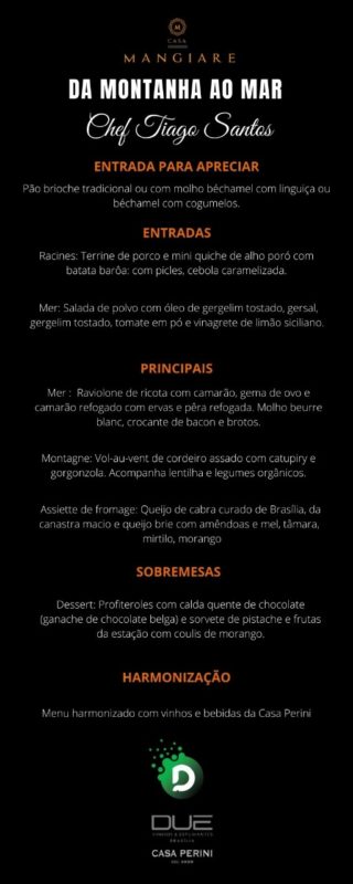 Nos dias 20 e 21 de novembro (sexta e sábado próximos), o chef Tiago Santos (Le Jardin Bistrot) irá apresentar algumas de suas preciosidades gastronômicas no menu da Casa Mangiare – com o tema “Da Montanha ao Mar” – e promete agradar muito quem participar do evento! Todas as etapas do jantar serão harmonizadas com vinhos da Casa Perini e água Sferriè. As reservas são limitadas e devem ser feitas pelo telefone (61) 984466968. O valor para participar dessa experiência mágica é de R$280,00.