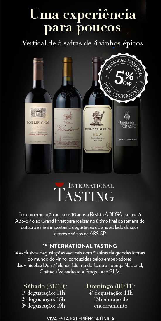 Quatro grandes nomes do mundo do vinho desembarcam no Brasil para o 1° International Tasting são os Embaixadores de Don Melchor, Quinta do Crasto Touriga Nacional, Chateau Valandraud e Stag’s Leap que vêm ao Brasil para conduzir degustações de cinco safras dos seus vinhos que são ícones no mundo inteiro. O evento, que acontece nos dias 31 de outubro e 1° de novembro será palco de quatro degustações verticais desses consagrados e exclusivos rótulos do Chile, Portugal, França e Estados Unidos – selecionados por sua qualidade e conceituado papel na história do vinho. O evento vai celebrar os 10 anos da revista Adega numa iniciativa da própria publicação, em parceria com Associação Brasileira de Sommeliers (ABS-SP) e com o Hotel Grand Hyatt.