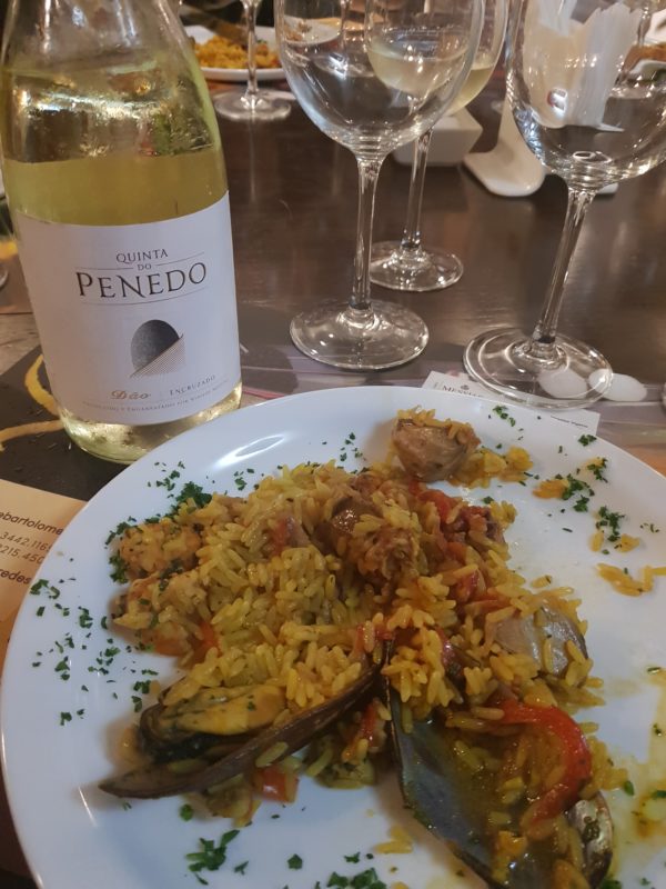 Depois tive a oportunidade de conhecer o vinho branco do Dão Quinta do Penedo, feito com a uva Encruzado. No nariz apresentou pera, na boca bastante mineralidade e frescor. A acidez foi média. O valor desse vinho: R$60,00. Ficou ótimo acompanhando uma paella marinera.