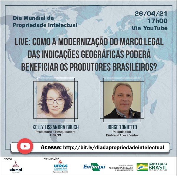 Como a modernização do Marco legal das Indicações Geográficas poderá beneficiar os produtores brasileiros? Este será o foco do bate papo entre Kelly Lissandra Bruch, professora e pesquisadora da Universidade Federal do Rio Grande do Sul (UFRGS), e Jorge Tonietto, pesquisador da Embrapa Uva e Vinho, para comemorar o Dia Mundial da Propriedade Intelectual, na próxima segunda-feira, dia 26 de abril. O evento será transmitido das 17h às 18h na canal da Faculdade de Direito da UFRGS no Youtube.