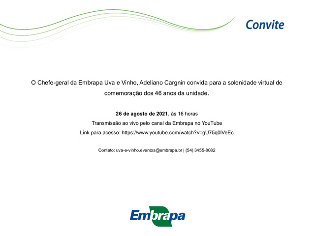A Embrapa Uva e Vinho (Bento Gonçalves, RS) irá comemorar nesta quinta-feira, dia 26 de agosto, às 16h, seus 46 anos de existência em uma cerimônia transmitida ao vivo pelo YouTube da Embrapa. O chefe-geral Adeliano Cargnin conduzirá o evento e Guy De Capdeville, diretor-executivo de Pesquisa e Desenvolvimento da Empresa, fará uma participação.