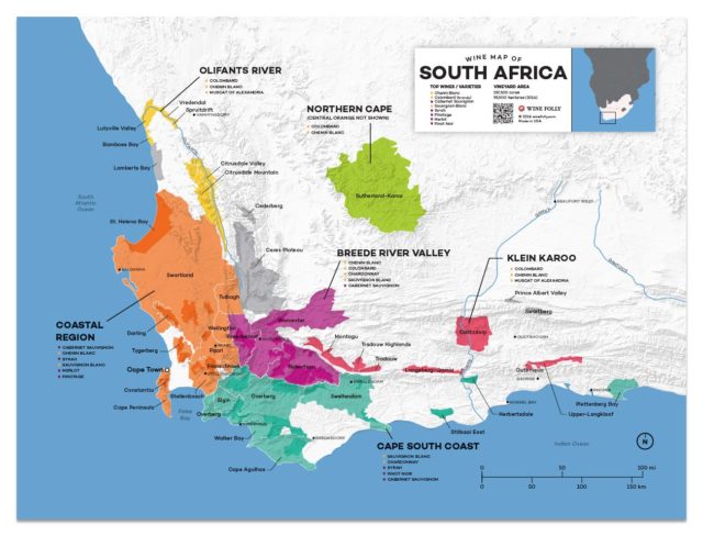 Existem seis Regiões Vinícolas na África do Sul (ver mapa abaixo), porém meus passeios se limitaram especialmente à chamada região costeira (Coastal Region), onde são produzidos a maior parte dos vinhos de qualidade do País. Ao todo, visitei 15 vinícolas escolhidas com o apoio da Wines South Africa, entidade que representa os produtores sul-africanos exportadores de vinho.