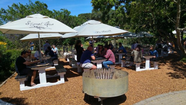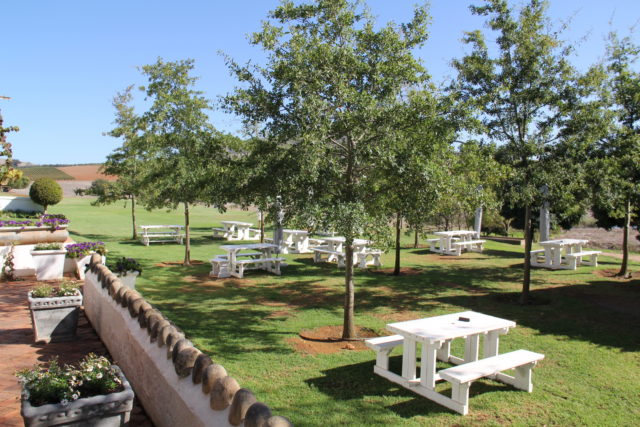 Os vinhos podem ser provados tanto na área interna quanto externa. Quem fica do lado de fora também tem direito a usufruir da estrutura do amplo jardim e de admirar a belíssima paisagem 🙂