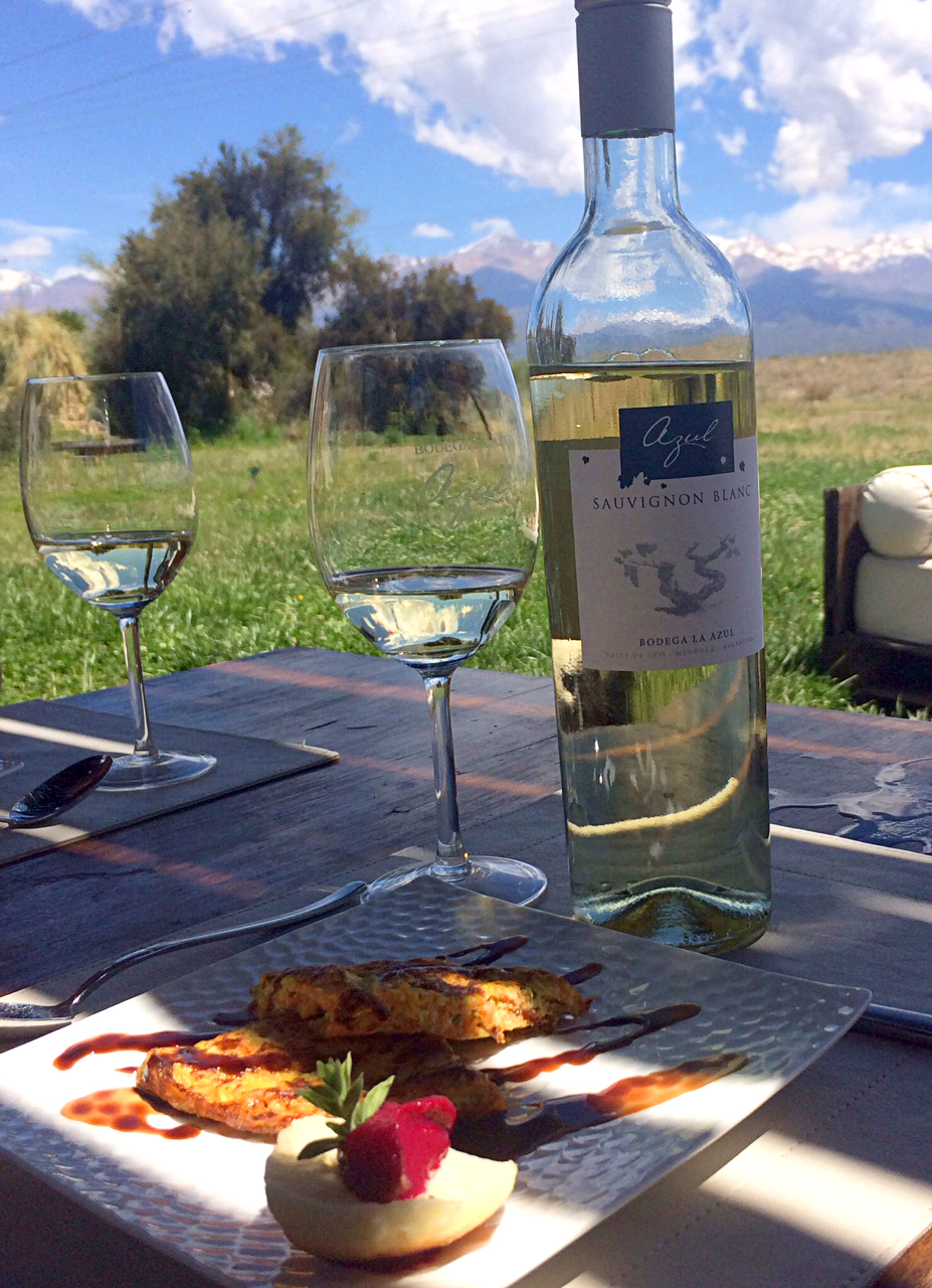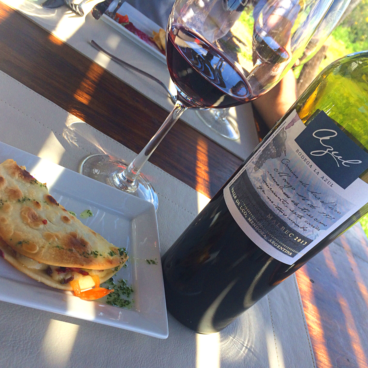 Almoço harmonizado – Depois de conhecer as instalações da pousada, fui almoçar no restaurante La Azul – um dos mais recomendados da região e que está localizado ao lado da pequena vinícola. O menu degustação tem cinco passos, é todo harmonizado, inclui três entradas, prato principal e sobremesa (essa eu confesso que não consegui comer de tão satisfeita que estava!) e custa 350 pesos. Destaco aqui o porco ao forno de barro (lechón). O porco fica quatro horas no forno e, por isso, a carne se desfaz na boca. Algo inexplicável!