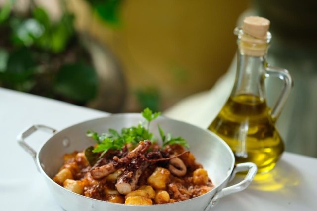 Nhoque de batata ao ragu de polvo e camarões