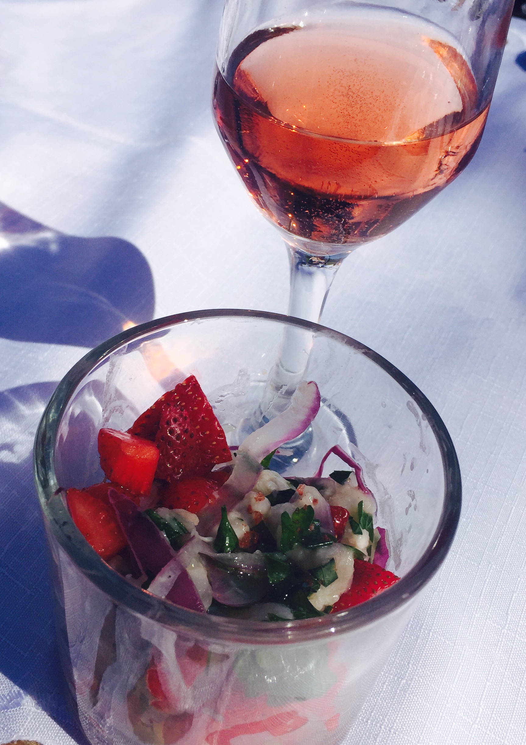 Logo em seguida, foi servido o menu em quatro etapas. Para a entrada, o saboroso Tartar de lagosta e morango com Chandon Brut Rosé.