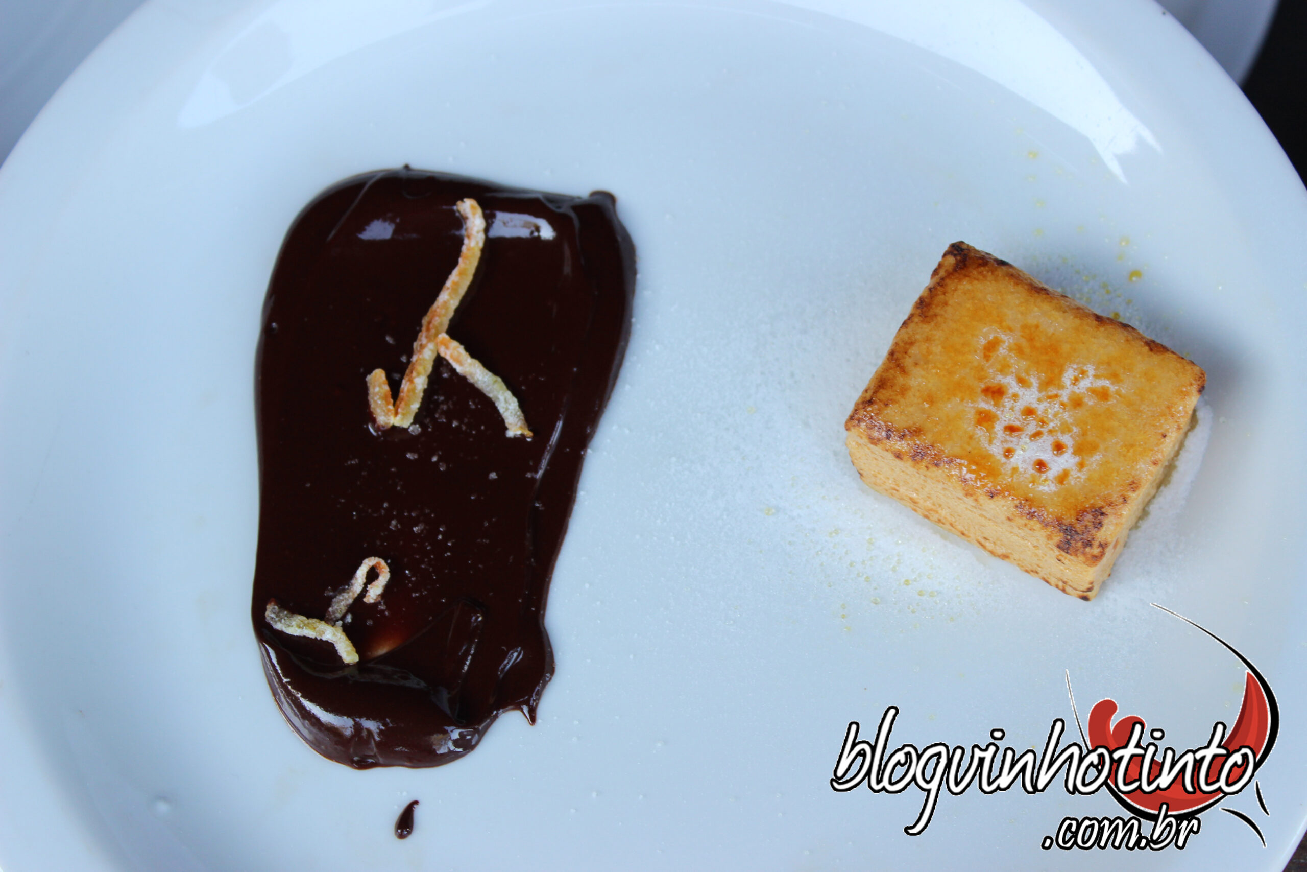 Finalizando a experiência gastronômica, sobremesa de Brulée de uísque e chocolate (da Fazenda Sagarana) com laranja caramelizada acompanhados de Chandon Passion.