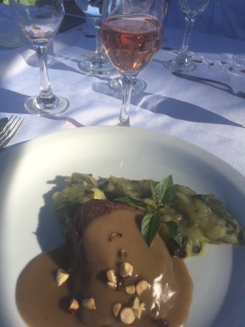 Depois, foi servido o segundo prato principal, Filé ao molho de café e cardamomo, brandade de batata, tomate, espinafre e chutney de manga com Chandon Excellence Rosé.