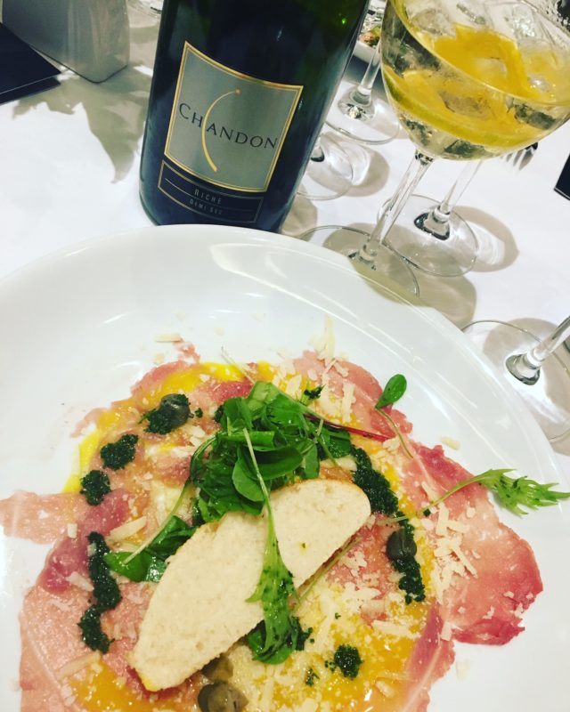 Logo no início foi servido o drink Chandon Fresh, elaborado com Chandon Rich demi-sec, fatias de laranja e pedras de gelo. Um drink super fresco, cítrico e aromático que escoltou muito bem o carpaccio de filet com brotos orgânicos e mel trufado, um prato leve e com toque doce. Sem dúvidas, um excelente exemplo de harmonização por afinidade.