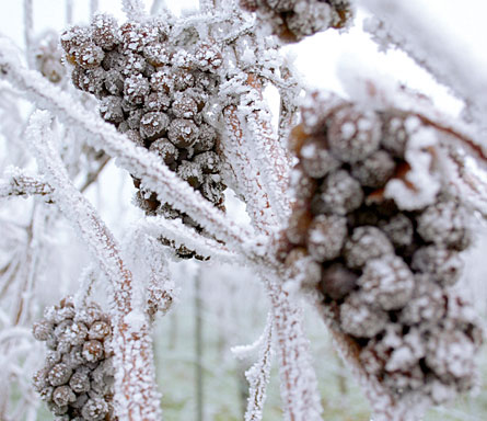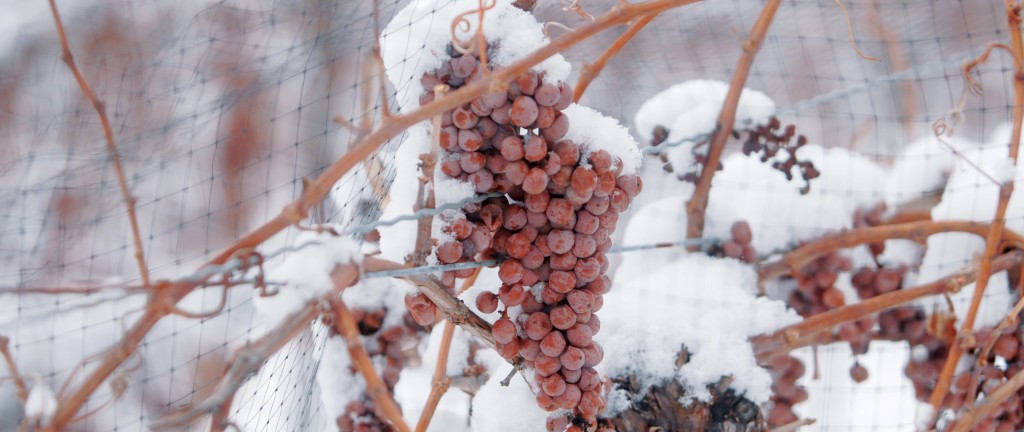 Magia do inverno – Na verdade, o Icewine pode ser considerado um verdadeira magia do inverno ou um presente desta estação do ano para os amantes de vinho. Foi desenvolvido originalmente nas regiões frias da Europa (na Alemanha, por exemplo, é chamado Eisewein), mas na Península do Niágara e no Vale do Okanagan, no Canadá, encontrou condições climáticas ideais para ser feito com perfeição. Por lá, em outubro, as uvas já encontram maturação plena, mas ficam nas videiras até o seu completo congelamento, algo que acontece em dezembro ou no início de janeiro, já no inverno canadense. Depois de completamente congeladas, essas uvas são colhidas manualmente quando a temperatura no vinhedo cai para -8°C o que garante um nível de açúcar ideal (a colheita ocorre normalmente à noite) e, em seguida, são levadas para a prensagem (separação do sólido e do líquido) que ocorre num processo contínuo e sempre a temperaturas iguais ou inferiores a -8°C Celsius.