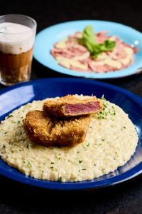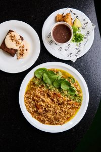 Almoço: Caldo de feijão com torresmo e cebolinha; arroz cateto caldoso com rabada desfiada, cozida lentamente no próprio caldo, finalizado com pesto de agrião; brownie de chocolate meio amargo com creme de doce de buriti e castanha de baru.