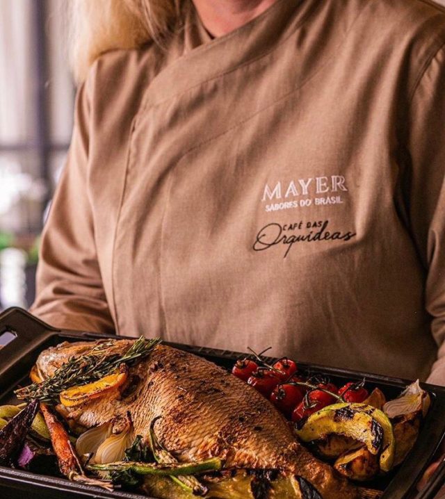 Há ainda o almoço a la carte, no qual se destacam a Lagosta na brasa, o Polvo na manteiga de alecrim e a Cioba assada inteira. Todos os vegetais oferecidos no Mayer são orgânicos e procedem do Sítio Samambaia e da Fazenda Malunga. O frango também é orgânico, sem aditivos. Delícia não é mesmo?