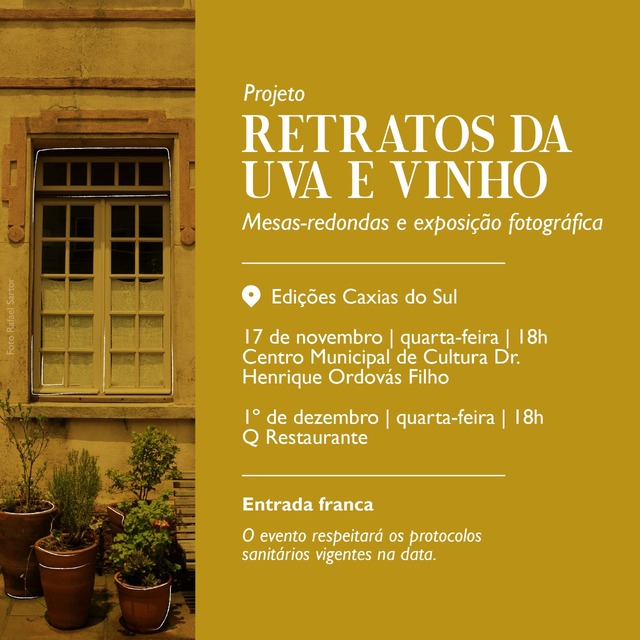 Para aguçar a curiosidade, disseminar as descobertas e feitos e compartilhar sobre o processo de desenvolvimento por trás do livro, o projeto “Retratos da Uva e Vinho” também realizará em novembro e dezembro quatro eventos com mesas-redondas e exposição fotográfica nas cidades deCaxias do Sul e Bento Gonçalves. Os encontros com entrada franca ocorrerem nos dias 16 e 30 novembro, em Bento, e nos dias 17 de novembro e 1º de dezembro, em Caxias, sempre às 18h. Os eventos respeitarão os protocolos sanitários vigentes na data.