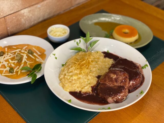 - Medalhão de filé com redução de vinho tinto e risotto de alho-poró