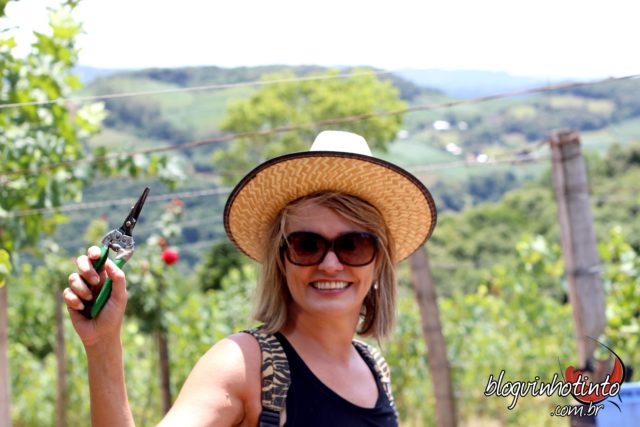 Devidamente equipados, com chapéu e tesoura, fomos caminhando até os vinhedos de Pinot Noir, localizados bem próximos à cantina da vinícola. A Faccin possui atualmente cerca de 4,5 ha de vinhedos. Nessa época do ano, é tudo lindo de se ver!