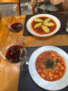 Nos pratos principais, o nhoque sardo com ragù de linguiça conquistou nosso paladar, mas foram os culurgiones, que roubaram a cena. Essa massa típica da Sardenha, moldada à mão em formato de espiga de trigo, é recheada com uma combinação cremosa de ricota fresca e hortelã vibrante. Cada mordida revelava um recheio suave e levemente aromático, onde a riqueza da ricota se harmonizava perfeitamente com o frescor da hortelã. Banhados em um molho pomodoro caseiro, bem tomatudo, alho dourado, manjericão fresco e azeite, os culurgiones revelaram uma verdadeira obra-prima da culinária italiana. E, claro, não poderia faltar a garoa generosa de queijo pecorino ralado na hora, que elevou os pratos a outro patamar. Para fechar com chave, optamos pelo pudim e pelo brownie, mas confessamos que não conseguimos terminar pois os pratos eram muito generosos nas porções.