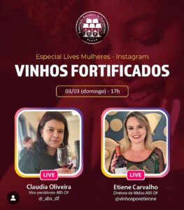 Para comemorar o Dia Internacional da Mulher, a ABSDF preparou uma série de lives com algumas profissionais do setor de vinho. A primeira delas aconteceu no dia 03 de março. A entrevistada foi Cláudia Oliveira, vice-presidente da ABSDF (na foto de vermelho). Ela é a única mulher do Centro-Oeste com o título Dip WSet 4 e também a única certificada internacionalmente em vinho do Porto, vinho Madeira e Jerez. O tema da live foi Vinho Fortificado. As lives serão conduzidas pela jornalista Etiene Carvalho (foto), diretora de Mídias da ABSDF, e ficarão disponíveis no instagram da @_abs_df.Veja a seguir as próximas lives