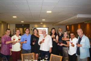 Eduardo Neto, o Duzinho, da Vinícola mineira Maria Maria (na foto com a blusa azul) esteve em Brasília no dia 1 de março exclusivamente para participar de um jantar harmonizado organizado pela Associação Brasileira de Sommeliers do DF no restaurante Dom Francisco da Asbac. Ele apresentou seis rótulos produzidos pela vinícola que foram harmonizados com um bem elaborado menu de comidas típicas de Minas Gerais. Maria Maria é uma das pioneiras na produção de vinhos de colheita de inverno no Brasil e tem esse nome para homenagear o cantor Milton Nascimento, amigo da família. Para a experiência ficar ainda mais completa, a cada etapa uma bela música de Milton foi tocada no violino. O jantar, organizado pelo diretor de eventos Fernando Brito, foi sucesso absoluto. Em Brasília, os rótulos da vinícola Maria Maria podem ser encontrados com exclusividade na Wine’s Life.
