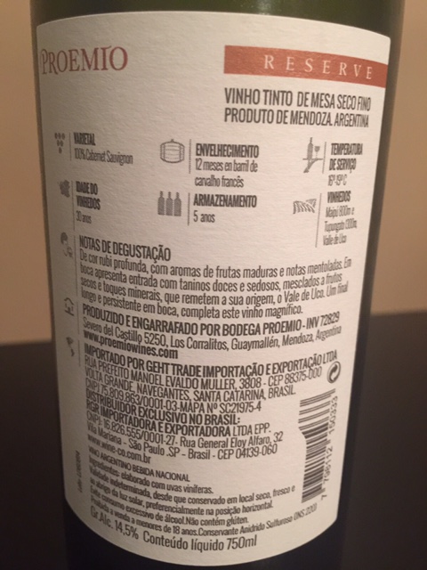 Avaliação Boca – Já na boca mostrou excelente equilíbrio entre a acidez e taninos, que estavam bastante aveludados. Segundo nossa opinião, o vinho está no seu auge e pronto para ser consumido, portanto, não há necessidade de esperar. Apesar de o Contrarrótulo sugerir cinco anos para guarda, o vinho é da safra 2013 e, concluímos, que quem comprá-lo agora, não vai precisar de mais quase três anos para apreciá-lo. Comparamos inclusive com um outro vinho Cabernet Sauvignon do mesmo ano de uma vinícola argentina também premiada e o Proemio Cabernet Sauvignon Reserve 2013 mostrou-se “muito mais vinho” e com um final “doce” muito menos pronunciado. Em resumo, ficamos impressionados com o vinho, e o consideramos melhor que muitos Malbec da região do Vale do Uco, além de ter um boa relação qualidade x preço, já que custa de US$13 a US$19, segundo a Wines of Argentina (e pesquisando no google, o encontramos aqui no Brasil na loja Dom Castillo Wine Store por R$92). Quem for ao evento, realmente, não poderá deixar de degustá-lo e depois, claro, dividir a opinião conosco aqui no blog.