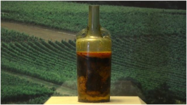 Das diversas garrafas que essa equipe de estudiosos encontrou nas escavações, apenas uma continha bebida. A garrafa de vidro espesso está exposta no Museu Histórico do Palatinado, em Speyer, no sudoeste da Alemanha, e estima-se que tenha sido fabricado no ano 325 da era cristã. Assim, ela teria incríveis 1.695 anos de existência.