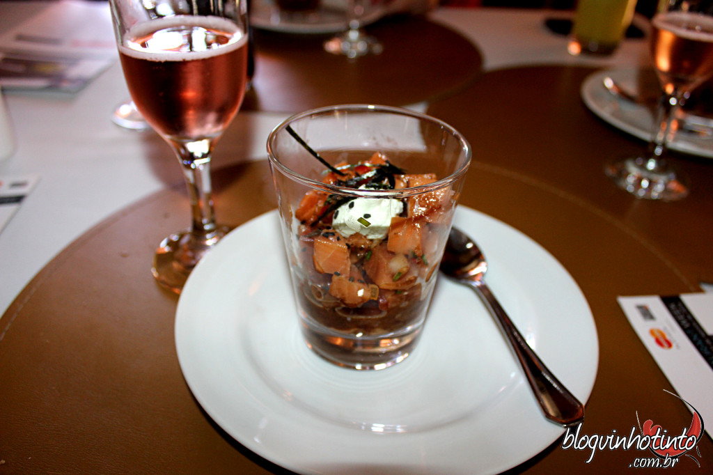 Espumante nacional e salmão cru – No Villa Tevere, durante o festival, a entrada e a sobremesa são as mesmas nos menus do almoço e do jantar, o que muda são os pratos principais. Por isso, se você for almoçar ou jantar, recomendo que peça o espumante nacional Malbec Rosé Don Guerino (R$89) para harmonizar com o tartare de salmone con chantilly di wasabi que é servido de entradinha. Como o prato é à base de salmão cru, o espumante rosé da Serra Gaúcha é um excelente acompanhamento. O frescor da bebida, aliado ao seu sabor levemente frutado e à sua alta acidez fazem com que seja um acompanhante perfeito para a refeição. Enfim, é uma bebida leve para um prato leve. Outra opção para quem quer beber só uma tacinha, pode ser o espumante nacional Baby Chandon Rosé de 187ml (R$31), com um final um pouco mais adocicado que o Don Guerino.