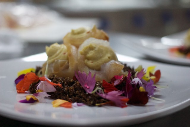 guariroba, crepinette de couve recheada com canjiquinha, cajá e redução