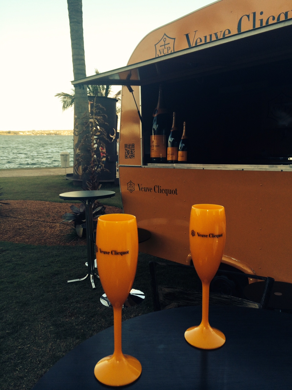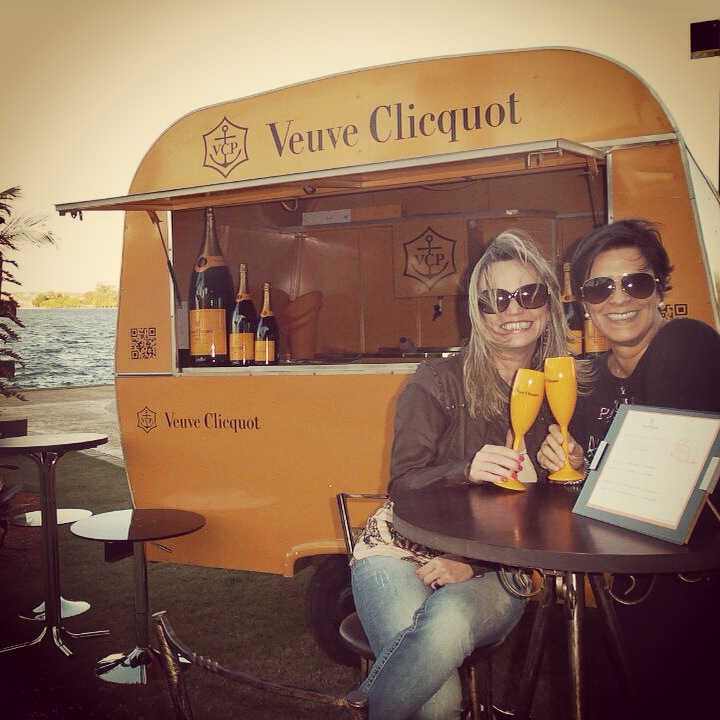 Fui conferir de pertinho o trailer da Veuve Clicquot, que depois de passar por Berlim, Sidney, Hong Kong e Tókio, chegou a Brasília e está no Pontão do Lago Sul (atrás do restaurante Soho). Quem me acompanhou no passeio foi a jornalista Adriana Nasser, do blog Pitaco de Chef. O trailer oferece o Brut Yellow Label a R$ 50 e a garrafa a R$ 280. Também vende a taça do Veuve Clicquot Rosé a R$ 60 e a garrafa por R$ 330. Quem compra no trailer ainda ganha a autêntica tacinha da Veuve Clicquot de presente. Sem dúvida alguma é uma bebida cara, mas gente, trata-se de um autêntico champanhe e, além disso, é ma-ra-vi-lho-so (perlage intensa, aroma de leveduras e brioche, frescor na boca). Isso sem falar que é um luxo só pode beber Veuve Clicquot vendo a tarde cair no Pontão. Recomendo “o momentinho de ostentação”.