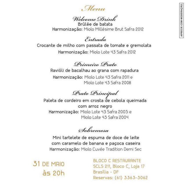 Fui convidada pela Miolo para participar do Wine Dinner de lançamento do Lote 43 safra 2012 em Brasília. O jantar aconteceu no dia 31 de maio, no Bloco C Restaurante e contou com a presença do enólogo Adriano Miolo. O menu foi desenvolvido pelo Chef Marcelo Petraca exclusivamente para a ocasião. A ideia foi harmonizar tudo com uma vertical do Miolo Lote 43 (safras 2004, 2005, 2008, 2011 e a nova 2012), para possibilitar aos convidados apreciarem a evolução do vinho ao longo dos anos. Confira o cardápio e a harmonização proposta: