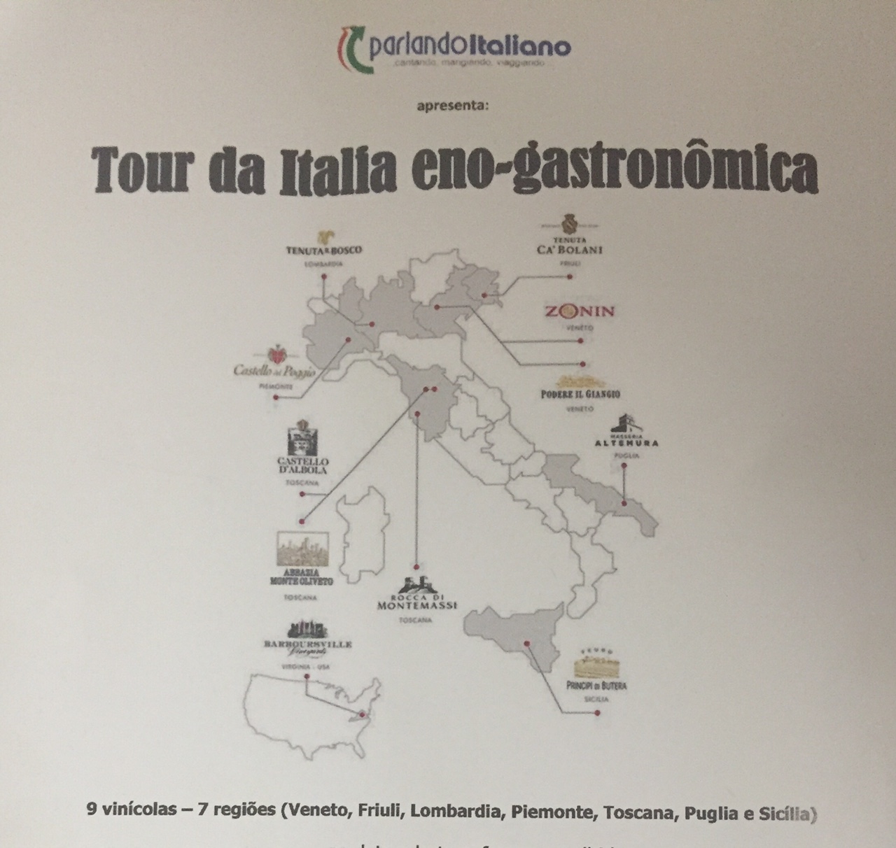 Valorização da Regionalidade – O próximo tour, inclusive, já tem data, roteiro e muitos interessados. Apesar de ser a 11ª viagem organizada por Antonello, vai ser a primeira a abranger praticamente toda Itália em quase 15 dias. Prevista para acontecer no período de 9 a 24 de outubro, irá incluir visitas a sete regiões do Norte ao Sul da Itália (Vêneto, Friuli, Lombardia, Piemonte, Toscana, Puglia e Sicília), além de passeio em nove vinícolas da Zonin – grupo que reúne renomadas marcas e cujos vinhos são reconhecidos mundialmente por resgatarem as produções regionais com uvas autóctones, isto é, com uvas originárias do local. Entre as vinícolas estão: Castelo D’ Albolla, Castello del Poggio e Feudo Principi di Butera.