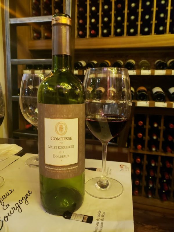 O vinho escolhido para acompanhar essa iguaria foi o Bordeaux Comtesse de Malet Roquefort 2015. Também me agradou muito, apesar de ter um estilo completamente diferente do Mercurey! Vinho mais encorpado com aromas de frutas negras, folhas secas, pimenta e tabaco. Os taninos são médio altos e acidez média alta. Esse é para quem procura vinho com mais estrutura. Finalizou bem a degustação.