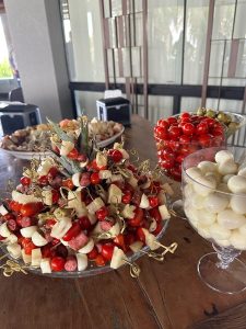 A mesa de frios foi um espetáculo à parte, com muitas iguarias como jamón serrano, carpaccio ao molho de mostarda com torradas crocantes, azeitonas temperadas e queijos variados, incluindo brie, emental e gorgonzola. Também teve Ceviche fresco e para aquecer os paladares, um strogonoff de filé cremoso também fez parte do cardápio, complementando a experiência gastronômica.