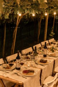 O cenário é verdadeiramente singular. As mesas são cuidadosamente dispostas sobre um deck sob a sombra de um vinhedo que, durante os meses quentes de verão, exala os delicados aromas das uvas, proporcionando um deleite aos visitantes. Nesse ambiente imersivo em meio à natureza, os sentidos são desafiados por uma experiência que é absolutamente única. Toalhas brancas e garrafas que guardam histórias, prontas para serem desvendadas, preparam o terreno para taças e pratos que deslumbram com suas complexas notas aromáticas e sabores, em uma atmosfera onde todos se sentem à vontade.