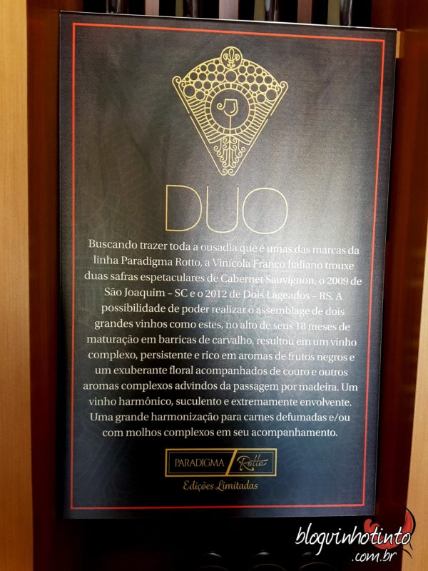 A vinícola, inclusive, produz vinhos de corte com uvas do mesmo nome, mas de locais diferentes. Como é o caso do Duo da linha Paradigma Rotto (R$65) que mescla duas safras de Cabernet Sauvignon, a 2009 de São Joaquim-SC e a 2012, de Dois Lageados-RS. (Essa é considerada uma linha premium da vinícola e, por isso, não foi servida na degustação).