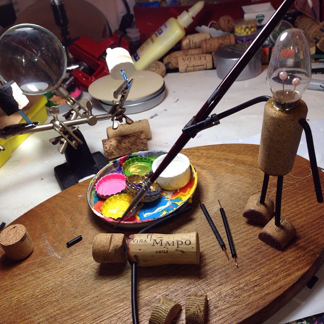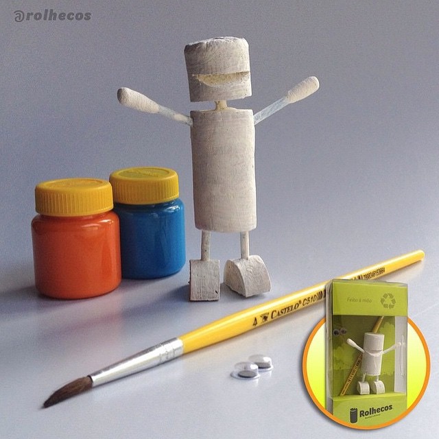 Blog – Quais os materiais utilizados na montagem de um Rolheco? Necessariamente reciclados? Quanto tempo, aproximadamente, você gasta para montar um? Paulo Grohmann – As rolhas são recicladas, mas os cotonetes são novos, eu juro (rsrs). Em diversos modelos uso fios elétricos e cabos coaxiais, também usados. Quando preciso de uma base para o Rolheco, uso tampa de lata de manteiga. Levo de cinco a 30 minutos para montar um Rolheco, depende da forma e da complexidade. Já a pintura e o acabamento podem levar horas, conforme o modelo sendo feito.