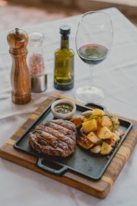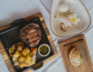 - Principal: Bife ancho na brasa, batatas e chimichurri