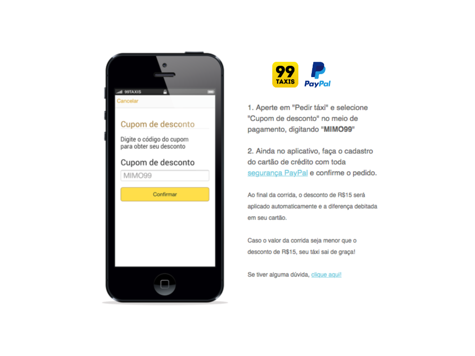 Quer curtir o Carnaval com mais tranquilidade? Então aproveite porque a 99Taxis, o mais popular aplicativo de táxis do Brasil, está concedendo descontos de R$ 15 em uma corrida nesses dias de folia. Para ter direito ao desconto é simples: Basta baixar o aplicativo 99Taxis para o celular, usar o cupom do desconto, que é o MIMO99, e pagar com cartão de crédito cadastrado no Paypal. Atenção vale só pra quem nunca participou de nenhuma promoção da 99Taxis, ok?