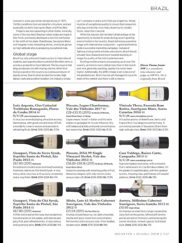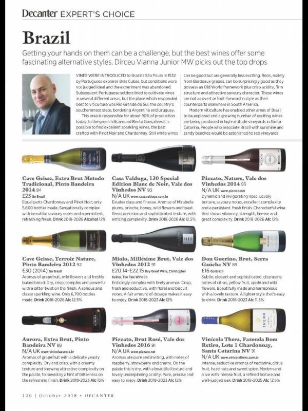 Ainda na edição de outubro da Decanter, que é conhecida como a “melhor revista de vinhos do mundo”, o único Master of Wine brasileiro, Dirceu Vianna Júnior, indica 18 produtos vitivinícolas brasileiros que representam o crescimento qualitativo da produção nacional. Ao todo são oito rótulos de espumantes, seis vinhos tintos e quatro brancos, da Serra e Campanha Gaúcha, Planalto Catarinense e região Noroeste de São Paulo.