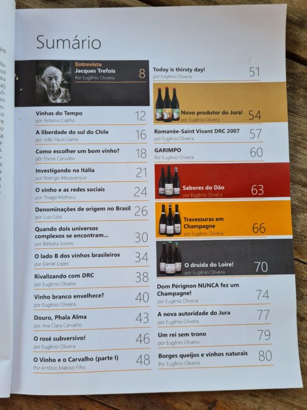 Dentre as matérias da revista, de conteúdo exclusivo, uma entrevista super especial com Jacques Trefois, detalhe sobre visitas à Emmanuel Lassaigne em Champagne e à Maxim Lannay no Jura. Sabores do Dão, Vinhos Naturais, Denominações de Origem no Brasil e envelhecimento de vinhos brancos também são abordados na publicação.