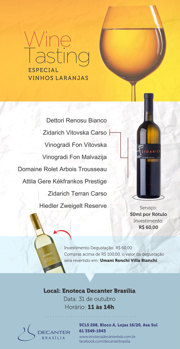 Ontem publiquei um post sobre os vinhos laranja (relembre aqui). Se você mora em Brasília, então, não pode perder a oportunidade de entender na prática o que tentei explicar, inclusive sobre a variação de cores e sabores existentes dentre os vinhos categorizados nesse estilo. É que no dia 31 de outubro, próximo sábado, a Enoteca Decanter, localizada no bloco A da 208 Sul, vai promover uma degustação especial somente de vinhos laranja. Quatro rótulos laranja e quatro tintos de locais mais exóticos serão degustados . O evento acontece das 11h às 14h. O valor da degustação é de R$60. Mais informações pelo telefone 3349 1943.