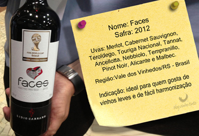 Podemos dizer que o Faces é o vinho do momento. É uma daquelas bebidas que todo mundo tem de experimentar, nem que seja só pra dizer que bebeu. Para nós, brasileiros, é uma honra, pois é o vinho escolhido pela FIFA para representar a Copa do Mundo de 2014. Uma ocasião imperdível para difundir o vinho