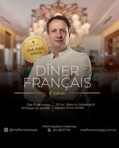 No dia 11 de maio, o chef francês Lionel Ortega promoverá a segunda edição do Dîner Français no Espaço Anna Caribé, na Asa Sul, com o tema Crème Brûlée, em dois horários para almoço e jantar, e apenas 24 vagas por sessão. As reservas podem ser feitas pelo telefone ou pelo site. O evento oferecerá uma experiência gastronômica completa, com cinco etapas acompanhadas de música ao vivo e sorteios do livro autografado “Crème Brûlée”, que apresenta 22 receitas da sobremesa clássica, além de contar sua história.Os participantes poderão harmonizar a refeição com vinhos selecionados por Ortega. Mais informações: @cheflionelortega