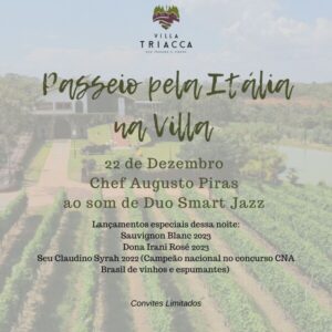 Dia 22 de dezembro haverá Passeio pela Itália na Villa. Uma iniciativa da Villa Triacca que inclui jantar harmonizado em cinco etapas com os vinhos da própria vinícola, som da Duo Smart Jazz e lançamento do Sauvignon Blanc 2023 e Dona Irani Rosé 2023, além de degustação do Seu Claudino Syrah 2022, campeão nacional do concurso CNA Brasil Vinhos e Espumantes. O Chef italiano Augusto Piras assina o menu do evento. @villatriaccahotelvinicola.
