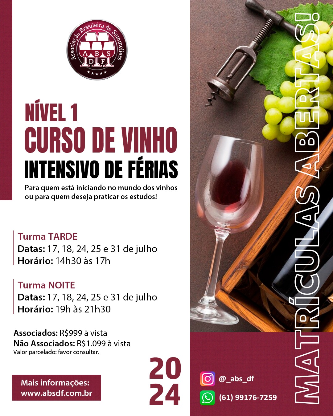 A Associação Brasileira de Sommeliers do Distrito Federal (ABSDF) acaba de anunciar o Curso Básico de Vinhos Nível 1 – Intensivo de Férias, destinado a