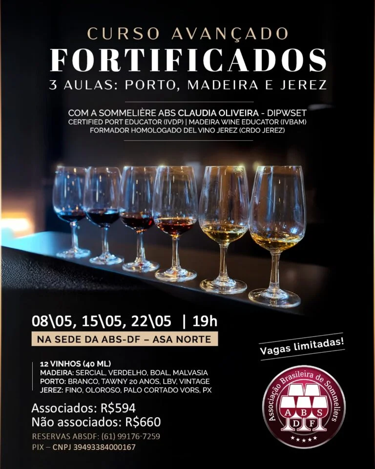 A Associação Brasileira de Sommeliers do Distrito Federal (ABS-DF) promove, nos dias 8, 15 e 22 de maio, o Curso Avançado Fortificados: Porto, Madeira e