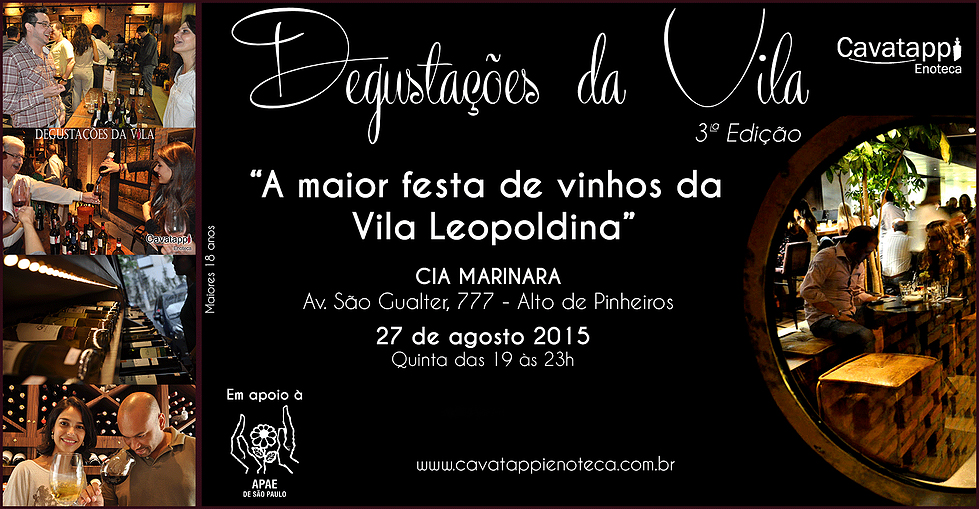 Degustações da Vila – 3ª Edição LOCAL – Cia Marinara – Av. São Gualter. 777 – Alto Pinheiros DATA – 27 de agosto, quinta-feira HORÁRIO – 19h VALOR – R$210,00 R$178,50 CONTATO – www.degustacoesdavila.com.br O
