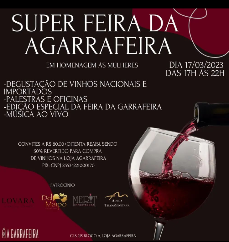 Essa sexta feira, dia 17 de março de 2023, ocorrerá o evento na área externa da A GARRAFEIRA – CLS 215, Bloco A, das 17h