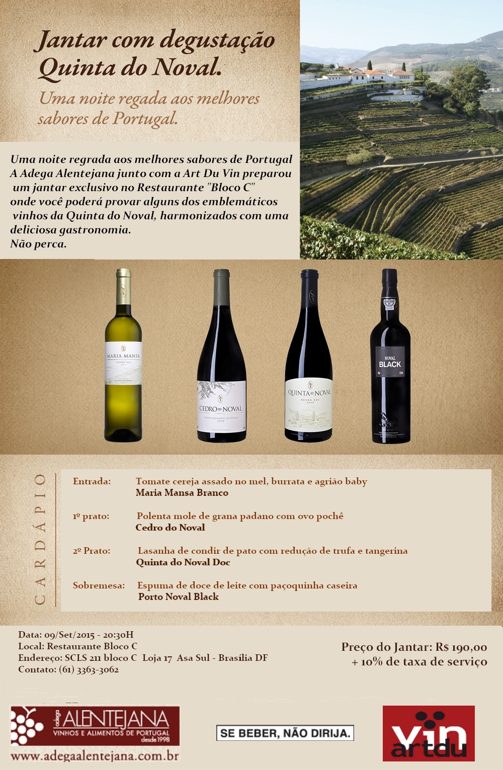 No próximo dia 09 de setembro (quarta-feira), às 20h30min, será realizado, em Brasília, um Jantar Harmonizado com Vinhos Portugueses Quinta do Noval. O evento é