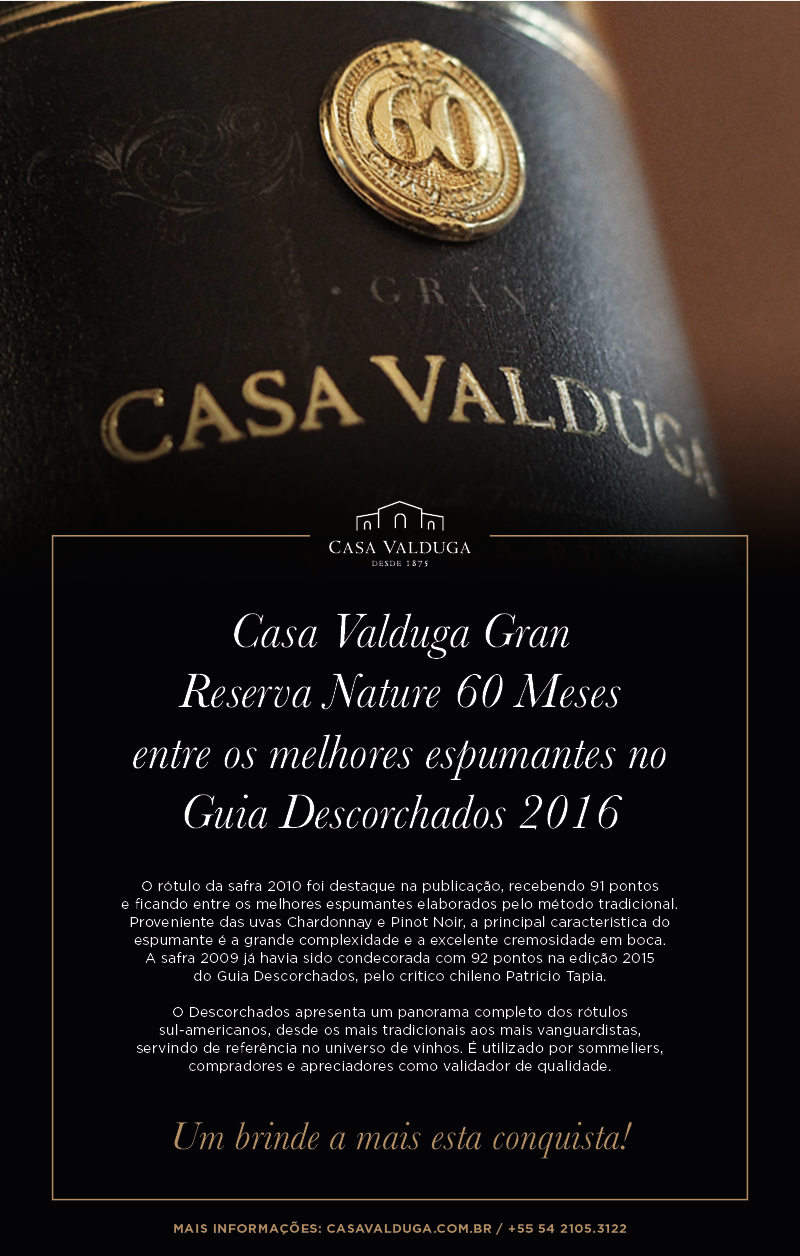 A Casa Valduga coleciona mais uma grande vitória. Desta vez com o espumante Gran Reserva Nature 60 meses, destacado entre os melhores no guia Descorchados 2016,