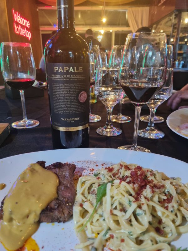 O Primitivo de Manduria Papale da Varvaglione não é novidade no portfólio da Domno. Ao contrário, já é um ícone da empresa. Ele é o tipo de vinho que deve ser apreciado tanto pra quem gosta da uva Primitivo como para quem não gosta. Ele é intenso e não é enjoativo. Tem açúcar residual bem equilibrado com sua acidez e taninos. Frutas maduras vermelhas e negras com notas de alcaçuz, cedro e cacau. Amadurece oito meses em barrica. Tem taninos sedosos e é persistente. Ficou ótimo com o Ancho na Parrilla ao molho dijon com fettuccine de carbonara servido na ocasião.