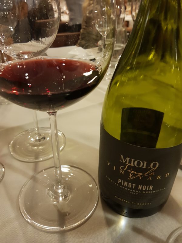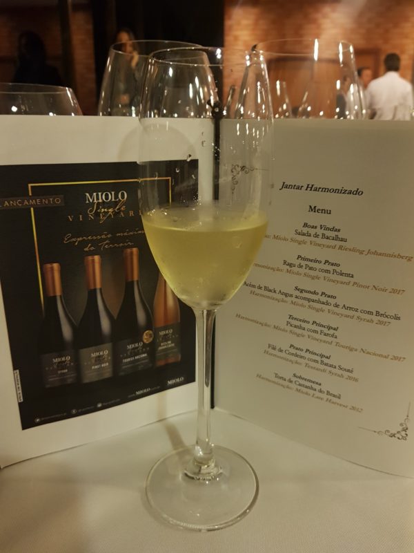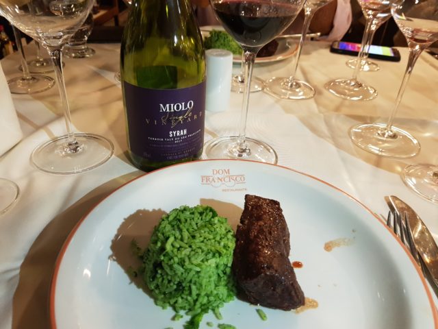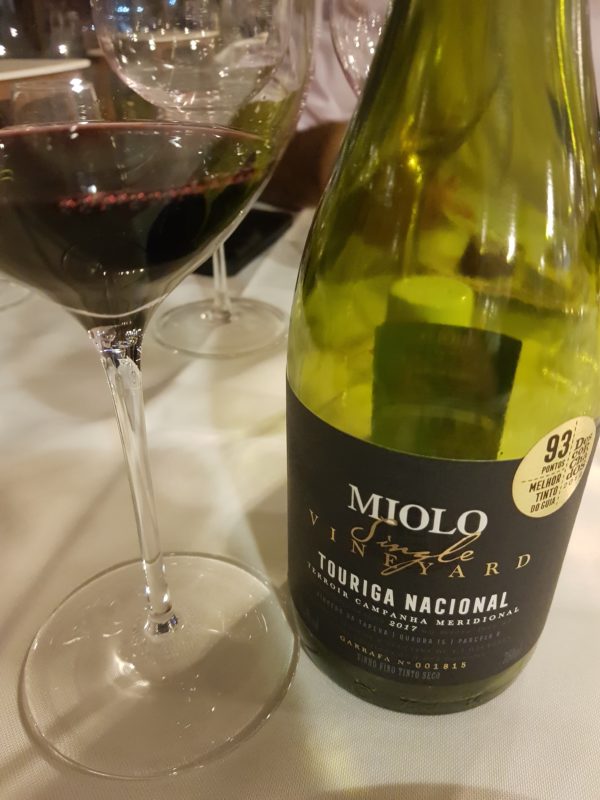 Vinhaço esse Touriga Nacional Miolo Single Vineyard. Pra quem não sabe a Touriga é uma nobre variedade portuguesa Touriga Nacional, que proporciona vinhos sofisticados, sabores intensos e aromas distintos. Esse da Miolo não perde para os portugueses de jeito nenhum. Ao contrário, chega a ser melhor que muitos deles. s uvas desse vinhos são colhidas em uma pequena parcela do Vinhedo da Tapera, na Campanha Meridional (RS).Possui uma bela cor rubi-violácea bem intensa. No nariz mostra um floral bem peculiar da casta. Um pouvo de notas de barrica também aparecem, mas de forma bem harmônica. Na boca é corpulento, com ótima acidez e bem equilibrado. Na boca, mostra frutas negras, violeta e um ligeiro toque terroso. Para mim, o melhor vinho da noite! Recomendo. Preço médio: R$85,00. Um detalhe importante. Esse vinho já nasceu premiado: foi considerado, pelo Guia Descorchados 2018, como o melhor tinto, com 93 pontos. Valor médio no site da Miolo – R$69,90.